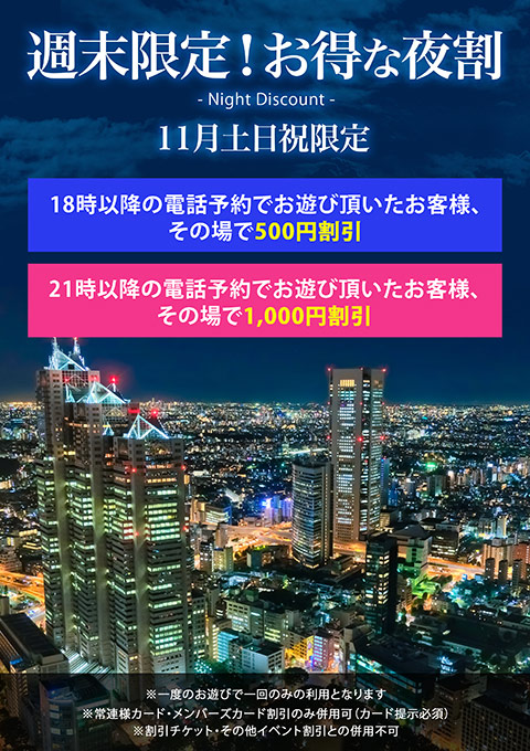 21時以降の電話予約でお遊び頂いたお客様、その場で1,000円割引
