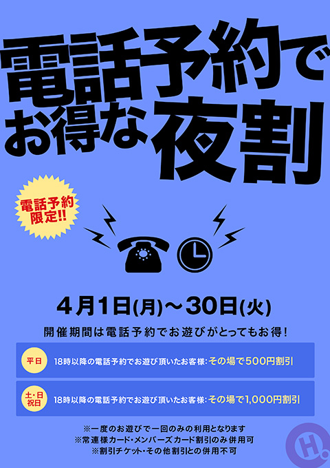 平日:18時以降の電話予約でお遊び頂いたお客様:その場で500円割引