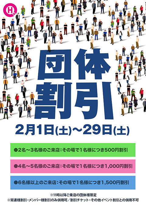 ●2名〜3名様のご来店:その場で1名様につき500円割引