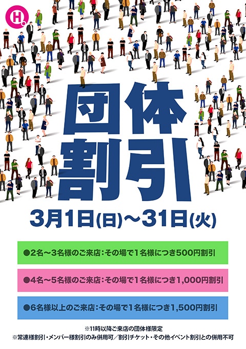 ●2名〜3名様のご来店:その場で1名様につき500円割引