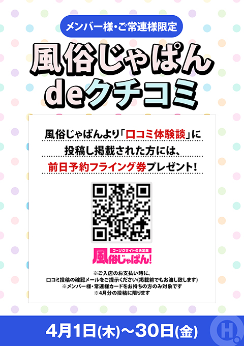 風俗じゃぱんより「口コミ体験談」に投稿し掲載された方には、前日予約フライング券プレゼント!
