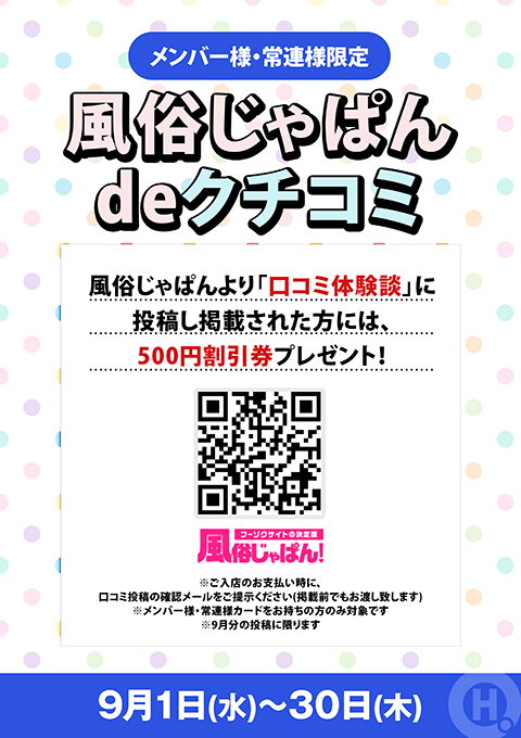 風俗じゃぱんより「口コミ体験談」に投稿し掲載された方には、500円割引券プレゼント!